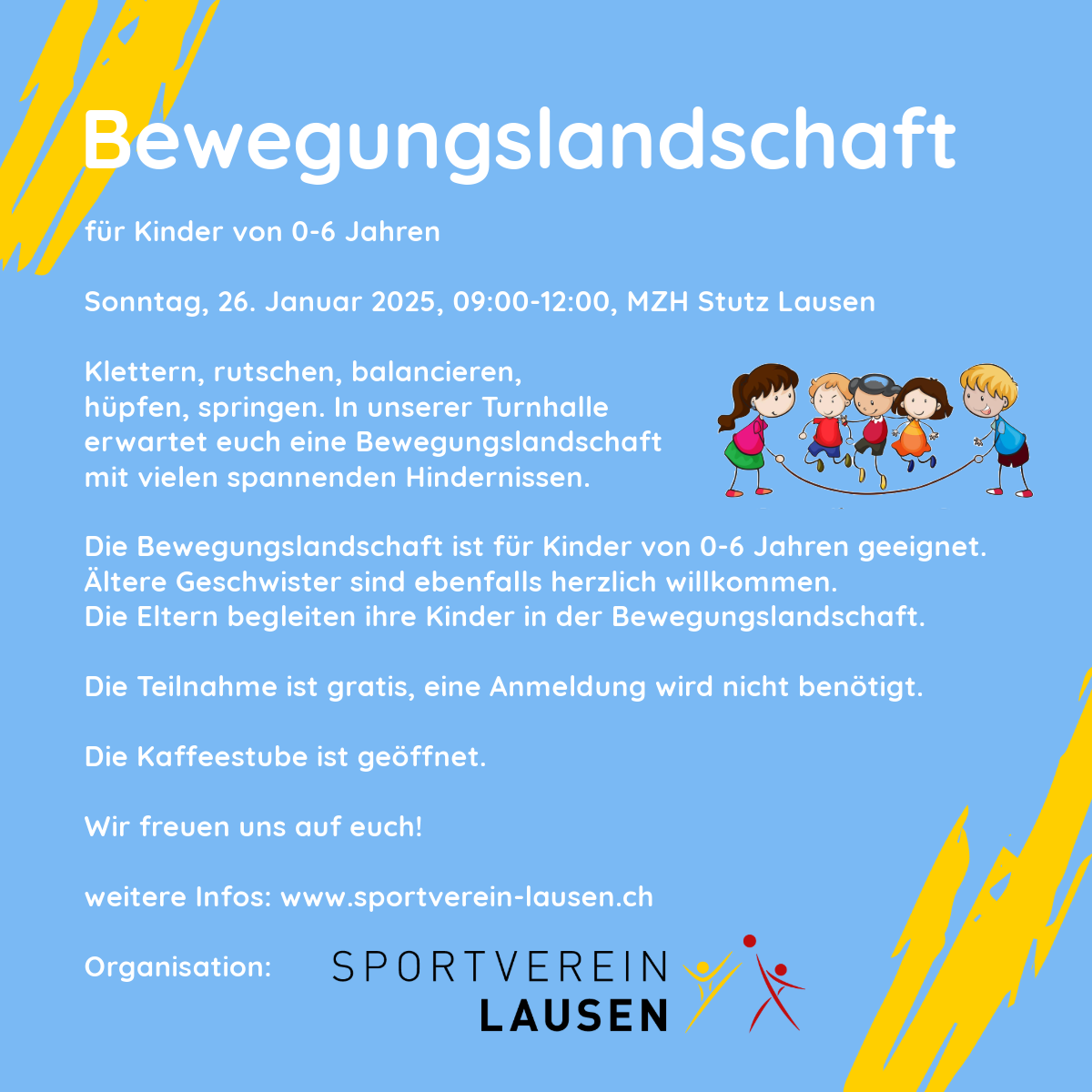 Mitbringen: sportliche Kleidung, Schläppli, Rutschsocken oder Hallenschuhe